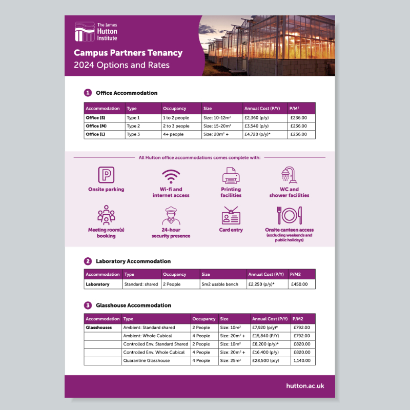 Working with the business development team at James Hutton Limited I created marketing material to support lead generation and income revenue streams. An example here shows a rate card for tenancy options aimed at prospective companies interested in renting the Hutton's onsite facilities.
